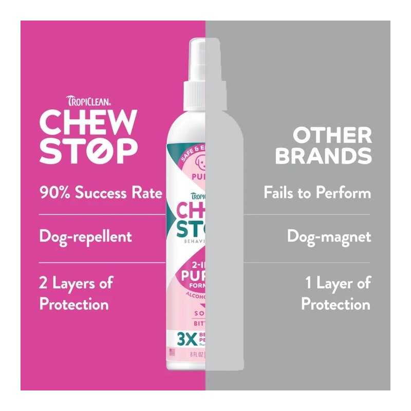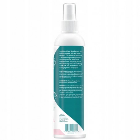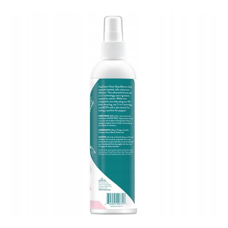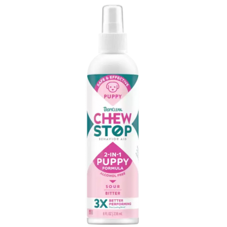 TropiClean Chew Stop Behavior Aid Puppy Spray to łagodny, a jednocześnie skuteczny preparat opracowany specjalnie dla szczeniąt. Pomaga chronić zabawki, legowiska, meble czy przewody przed gryzieniem i lizaniem. Naturalna, nietoksyczna formuła o gorzkim i kwaśnym smaku skutecznie zniechęca młode psy do niepożądanego zachowania i wspiera pozytywne szkolenie.