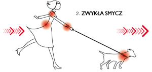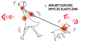2. Problemem zwykłych smyczy jest ich sztywność, brak amortyzacji przy gwałtownych szarpnięciach może doprowadzać do kontuzji, a nawet zagrażać bezpieczeństwu psa i opiekuna. Co więcej, podczas użytkowania zwykłej smyczy środek ciężkości psa i przewodnika jest niestabliny, łatwo stracić równowagę i kontrolę.