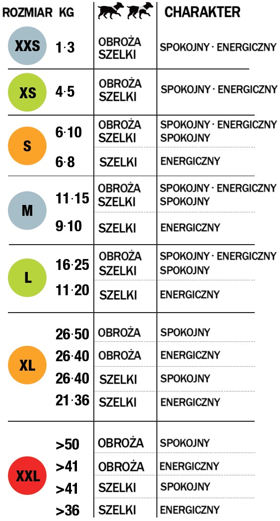 Dla: psów o wadze 16-25kg, noszących obrożę, o charakterze spokojnym i energicznym