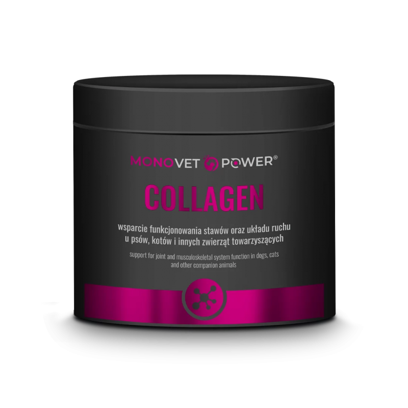 MONOVET POWER® – COLLAGEN wspiera regenerację chrząstek, poprawia ich elastyczność, zwiększa produkcję mazi stawowej oraz przyspiesza odbudowę zdrowej tkanki łącznej, wpływa też na kondycję skóry i sierści, pobudzając procesy gojenia i wzmacniając ich strukturę