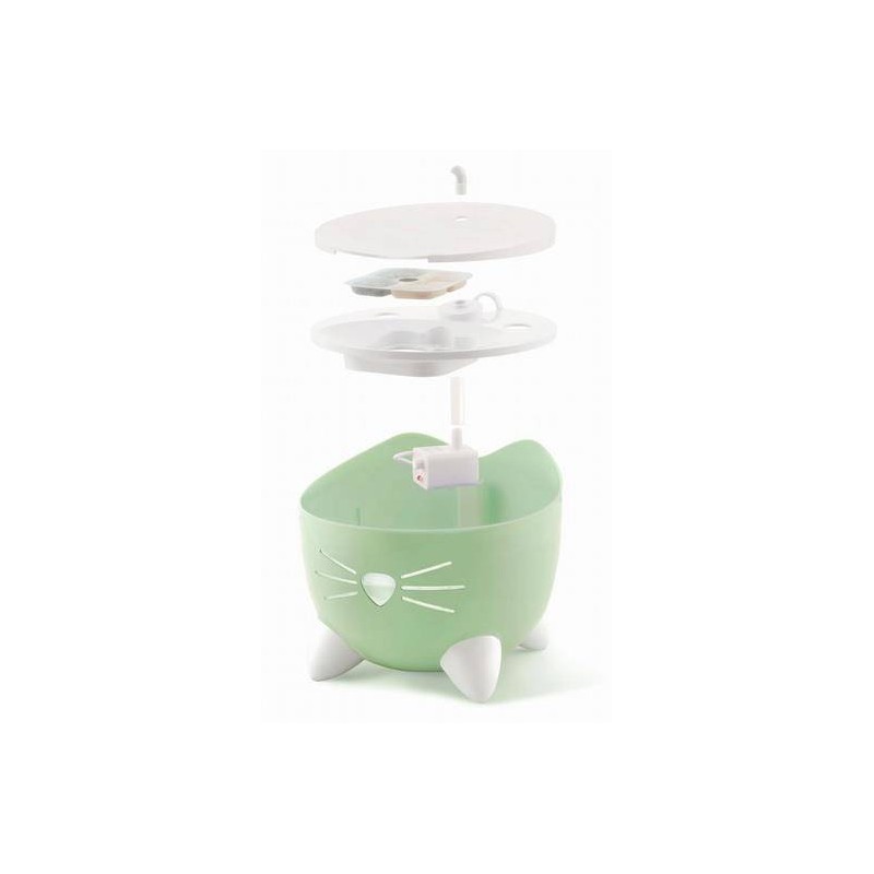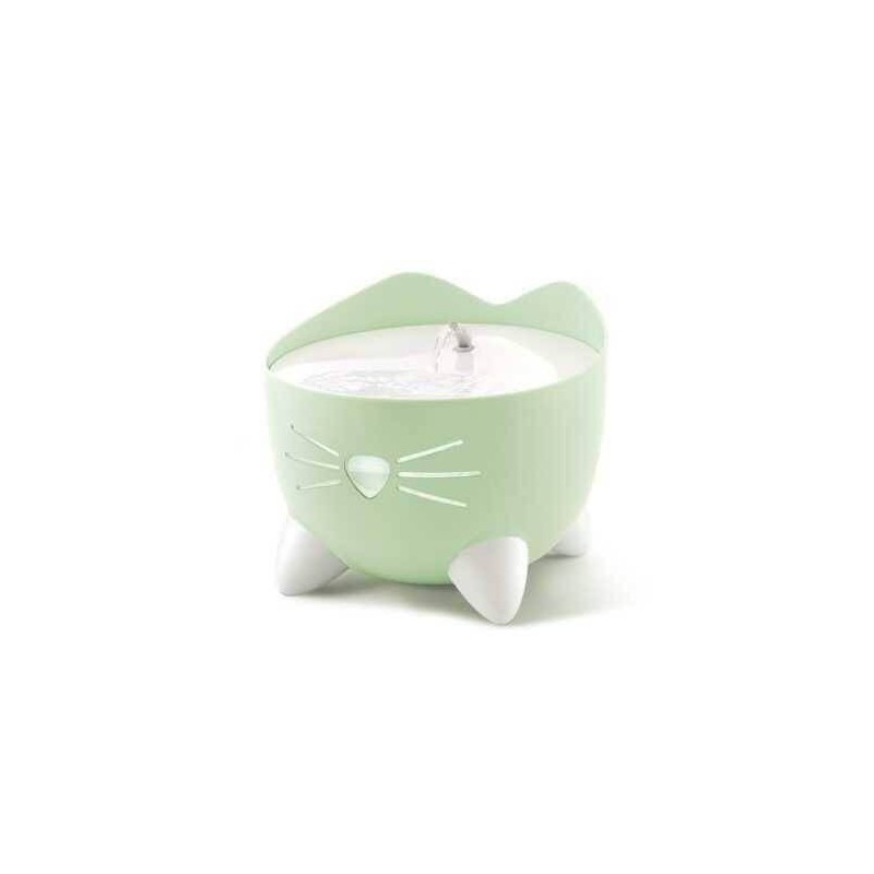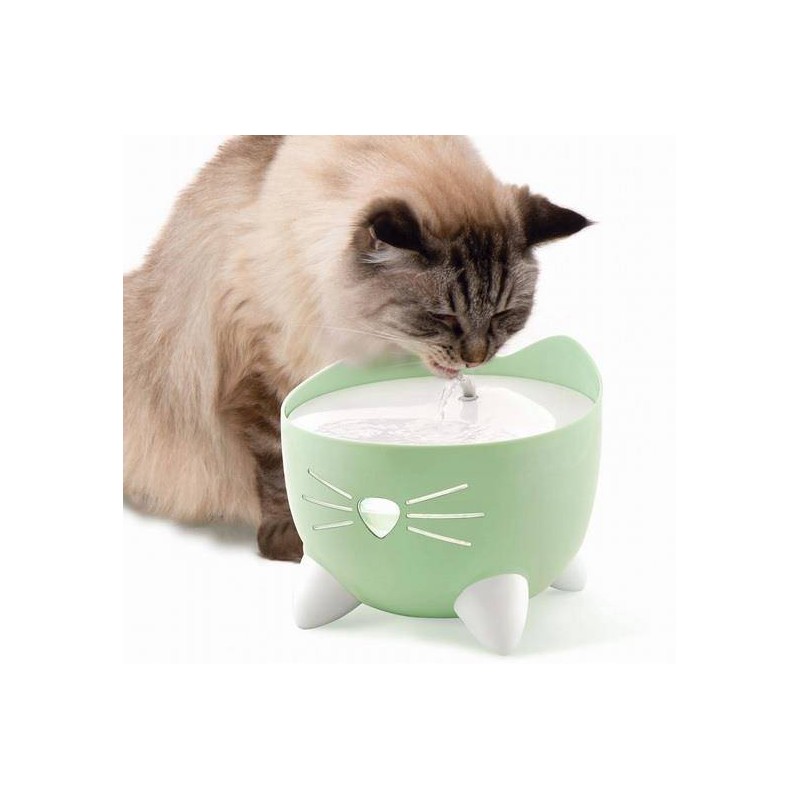 Catit PIXI to fontanna o oryginalnym i uroczym kształcie kotka z małymi łapkami i wąsami. Poidło dla kota oprócz cudownego wyglądu charakteryzuje się również wysoce funkcjonalnymi cechami, które zapewniają płynną pracę. W zależności od wybranego ustawienia, bieżąca woda tworzy bąbelki lub może płynąć strumieniem. Urządzenie posiada wydajną pompkę, zawieszoną w zbiorniku dzięki czemu praca fontanny jest bardzo cicha. Filtr, w który wyposażona jest fontanna czyści wodę i usuwa nieprzyjemne zapachy. Dodatkowo woda jest zmiękczana poprzez redukcję poziomu magnezu i wapnia. Gdy poziom wody spadnie poniżej minimum, pompa automatycznie wyłączy się, dzięki czemu nie ma obawy o jej uszkodzenie.