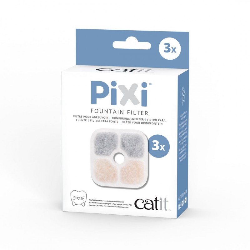 Filtry do fontanny Catit PIXI o potrójnym działaniu, są zbudowane w inny sposób niż zwykłe filtry fontannowe. Zapewniają taką samą filtrację jak dużo większe filtry z poprzednich modeli firmy Catit, jednak wykonane są bez plastikowej ramy, aby zmniejszyć ilość plastiku i być bardziej przyjazne dla środowiska. Wykonane przez sprasowanie materiału za pomocą specjalnej maszyny.