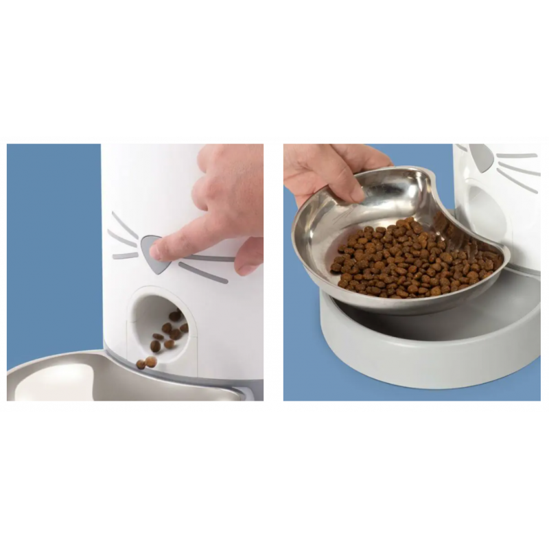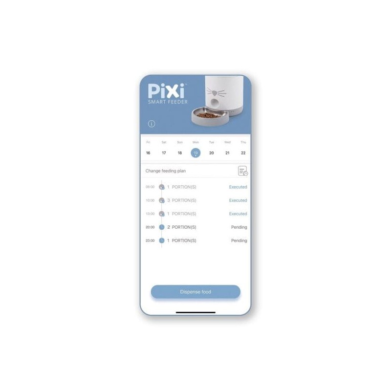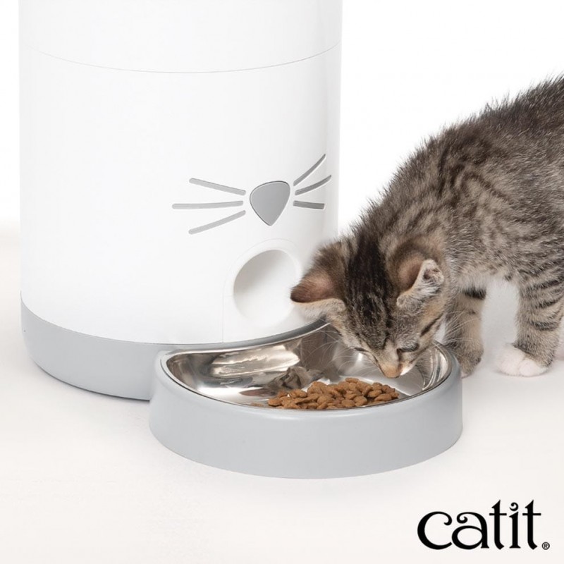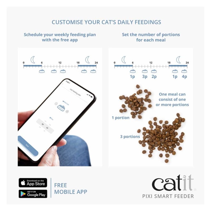 Karmnik Catit Pixi Smart pozwoli na zdalne karmienie (gdy utkniesz późno w biurze lub z dala od domu na noc) lub na karmienie w ciągu dnia mniejszymi porcjami. Stały, swobodny dostęp do karmy umożliwia kotom jedzenie wielu posiłków w ciągu dnia, co jest zdrowym i prawidłowym zachowaniem. Równocześnie prowadzi jednak do przejadania się i pobierania zbyt dużej ilości pokarmu, co powoduje otyłość. Dzięki podajnikowi do kontroli porcji, takim jak Pixi Smart Feeder, można to kontrolować.