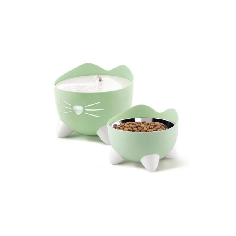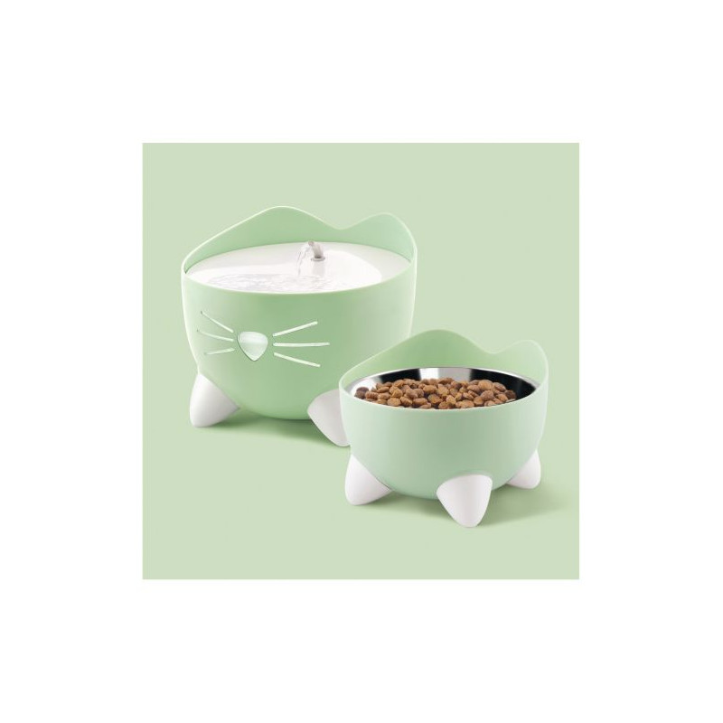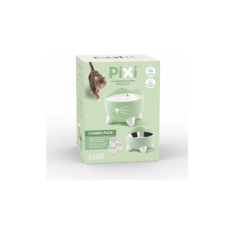 Catit PIXI to fontanna o oryginalnym i uroczym kształcie kotka z małymi łapkami i wąsami. Poidło dla kota oprócz cudownego wyglądu charakteryzuje się również wysoce funkcjonalnymi cechami, które zapewniają płynną pracę. W zależności od wybranego ustawienia, bieżąca woda tworzy bąbelki lub może płynąć strumieniem. Urządzenie posiada wydajną pompkę, zawieszoną w zbiorniku dzięki czemu praca fontanny jest bardzo cicha. Filtr, w który wyposażona jest fontanna czyści wodę i usuwa nieprzyjemne zapachy. Dodatkowo woda jest zmiękczana poprzez redukcję poziomu magnezu i wapnia. Gdy poziom wody spadnie poniżej minimum, pompa automatycznie wyłączy się, dzięki czemu nie ma obawy o jej uszkodzenie.