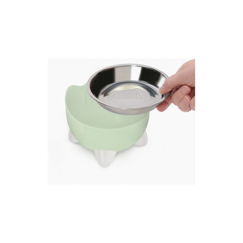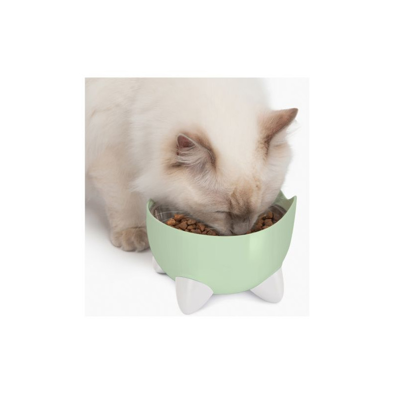 Dzięki niewielkiemu podwyższeniu miski pokarm Twojego kota jest odsunięty od podłoża, co pozwala na wygodne jedzenie bez nadwyrężania szyi. Naczynie ze stali nierdzewnej mieści się w plastikowym uchwycie, podpartym czterema łapkami, uniemożliwiającymi przewrócenie miski.