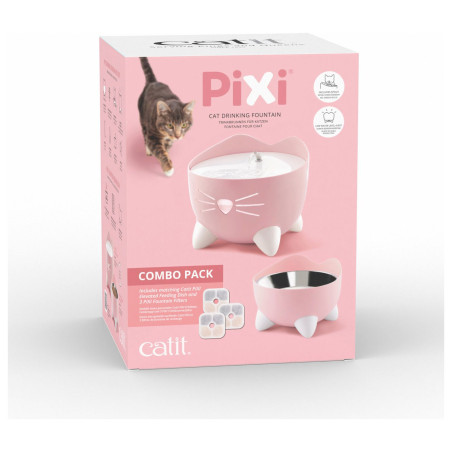 Catit PIXI to fontanna o oryginalnym i uroczym kształcie kotka z małymi łapkami i wąsami. Poidło dla kota oprócz cudownego wyglądu charakteryzuje się również wysoce funkcjonalnymi cechami, które zapewniają płynną pracę. W zależności od wybranego ustawienia, bieżąca woda tworzy bąbelki lub może płynąć strumieniem. Urządzenie posiada wydajną pompkę, zawieszoną w zbiorniku dzięki czemu praca fontanny jest bardzo cicha. Filtr, w który wyposażona jest fontanna czyści wodę i usuwa nieprzyjemne zapachy. Dodatkowo woda jest zmiękczana poprzez redukcję poziomu magnezu i wapnia. Gdy poziom wody spadnie poniżej minimum, pompa automatycznie wyłączy się, dzięki czemu nie ma obawy o jej uszkodzenie.