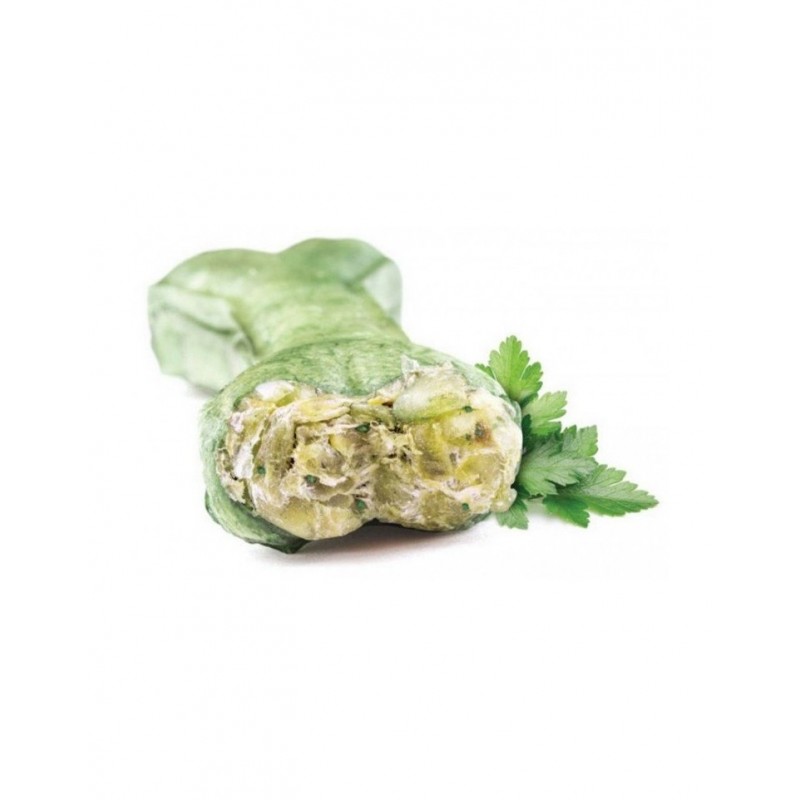 PAWERCE Dental Bone to smaczny naturalny gryzak w postaci nadziewanej kostki, przeznaczony dla psów ras średnich. Dzięki użyciu twardej, suszonej skóry wołowej, baton pełni również rolę gryzaka dla psa, który podczas intensywnego gryzienia i żucia, mechanicznie oczyszcza zęby z osadu i resztek pokarmowych.