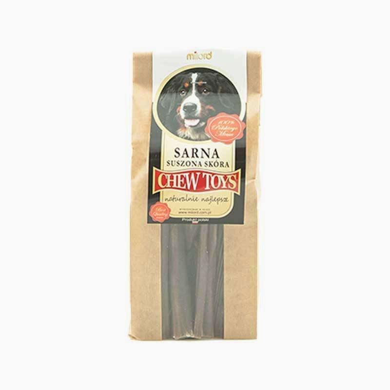 Suszona skóra sarny to naturalny gryzak marki Milord dla psa, który zajmie go na długie godziny. Aromatyczna skóra z sarny nie zawiera konserwantów, barwników ani polepszaczy smaku, dzięki czemu jest bezpieczna dla czworonoga. Podczas gryzienia pupil usuwa kamień nazębny i masuje dziąsła, co poprawia kondycję jamy ustnej. Produkt jest suszony ciepłym powietrzem, bez użycia konserwantów, dzięki czemu zachowuje swoje naturalne wartości odżywcze.