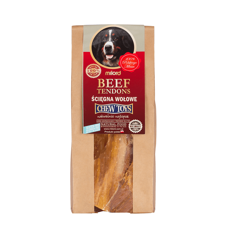 Suszone ścięgna wołowe to jedne z najtwardszych i najwytrzymalszych gryzaków dla psów. Świetnie sprawdzą się u pupili dużych i średnich ras. Ich zaletą jest dość naturalny zapach. Są one suszone ciepłym powietrzem w niskich temperaturach, co zapewnia bezpieczeństwo epidemiologiczne, bez konieczności użycia środków chemicznych i konserwujących. Smakołyki zostały wyprodukowane ze ścięgien wołowych polskiego pochodzenia.