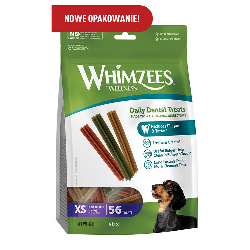 Higiena jamy ustnej u psów jest tak samo ważna, jak u ludzi, a gryzaki dentystyczne Whimzees ułatwiają psom codzienne oczyszczanie zębów. Stixy Whimzees, to gryzaki dentystyczne dedykowane dla psów wszystkich ras. Są wegetariańskie i w pełni naturalne, całkowicie jadalne i łatwo przyswajalne. Pomagają odświeżyć oddech i zmniejszyć osad gromadzący się na zębach Twojego psa. Nie zawierają glutenu, dlatego są świetnym rozwiązaniem dla psów wrażliwych.