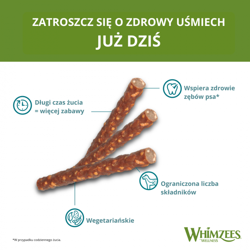 Higiena jamy ustnej u psów jest tak samo ważna, jak u ludzi, a gryzaki dentystyczne Whimzees ułatwiają psom codzienne oczyszczanie zębów. Kiełbaski Whimzees, to gryzaki dentystyczne dedykowane dla psów wszystkich ras. Są wegetariańskie i w pełni naturalne, całkowicie jadalne i łatwo przyswajalne. Pomagają odświeżyć oddech i zmniejszyć osad gromadzący się na zębach Twojego psa. Nie zawierają glutenu, dlatego są świetnym rozwiązaniem dla psów wrażliwych.