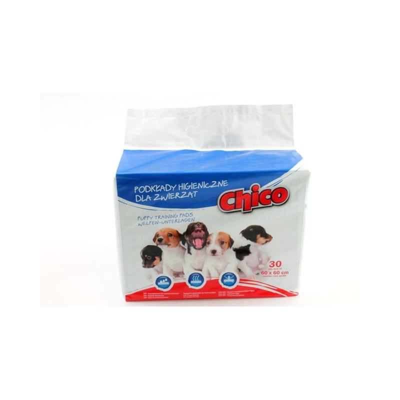 Maty absorbujące Chico do nauki czystości dla szczeniąt. Maty zostały nasączone specjalnym atraktorem, dzięki czemu pomagają chronić powierzchnię, gdy szczenięta uczą się załatwiać swoje potrzeby fizjologiczne w wybranych miejscach. Pochłaniają wilgoć gromadząc ją głęboko na dnie, dzięki czemu powierzchnia maty pozostaje sucha. Nieprzemakalna mata chroni podłoże przed przedostaniem się nawet najmniejszej ilości moczu. Maty idealnie nadają się również dla dorosłych psów przebywających w domu przez cały dzień, dla psów w okresie rekonwalescencji oraz jako zabezpieczenie podczas podróży.