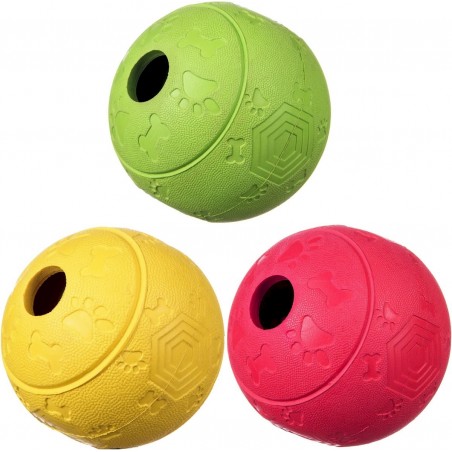 Trwała zabawka na przysmaki dla psa w kształcie piłki. Jej główną zaletą jest umieszczony w środku labirynt, który sprawia, że pupil musi się namęczyć aby wyciągnąć swój ulubiony przysmak. Piłka jest twarda, odporna na gryzienie.