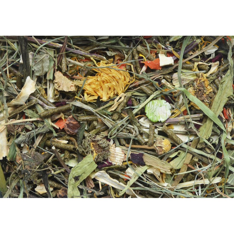 Skład: Suszona trawa, otręby pszenne, płatek grochu, suszona: marchew, pasternak, burak, kwiat nagietka, babka lancetowata, łodyga mięty, suszony kalafior, fasolka szparagowa, siemię lniane, ziele owsa, koniczyna, nasiona słonecznika, spirulina, inulina, ekstrakt z Yukki schidigera, minerały.