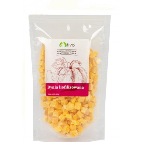 Dynia jest lekkostrawna, niskokaloryczna, bogata we włókno surowe. Dynia liofilizowana TIVO wyprodukowana została bez dodatku cukru i oleju.