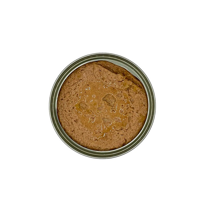 Skład: Tuńczyk (26%), mięso kurczaka (mielone z kością) (24%), bulion z kości kurczaka(16%), bulion z kości ryb (16%), suszona dynia, olej z łososia (3%), minerały.