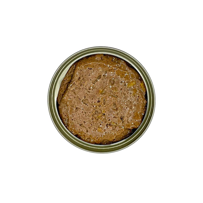 Skład: Mięso wołowe (17%), mięso kurczaka (17%), bulion z kości wołowych (16%), wątroba wołowa (12%), tuńczyk (12%), bulion z kości kurczaka (10%), suszona dynia, olej z łososia (1%), minerały.