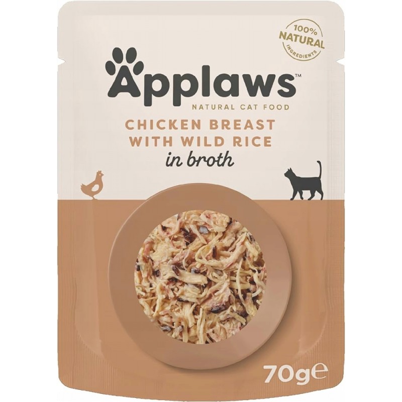 Karma mokra dla kotów Applaws Kurczak z dzikim ryżem zawiera wyselekcjonowane składniki - soczyste kawałki filetów z kurczaka oraz dodatek dzikiego ryżu.