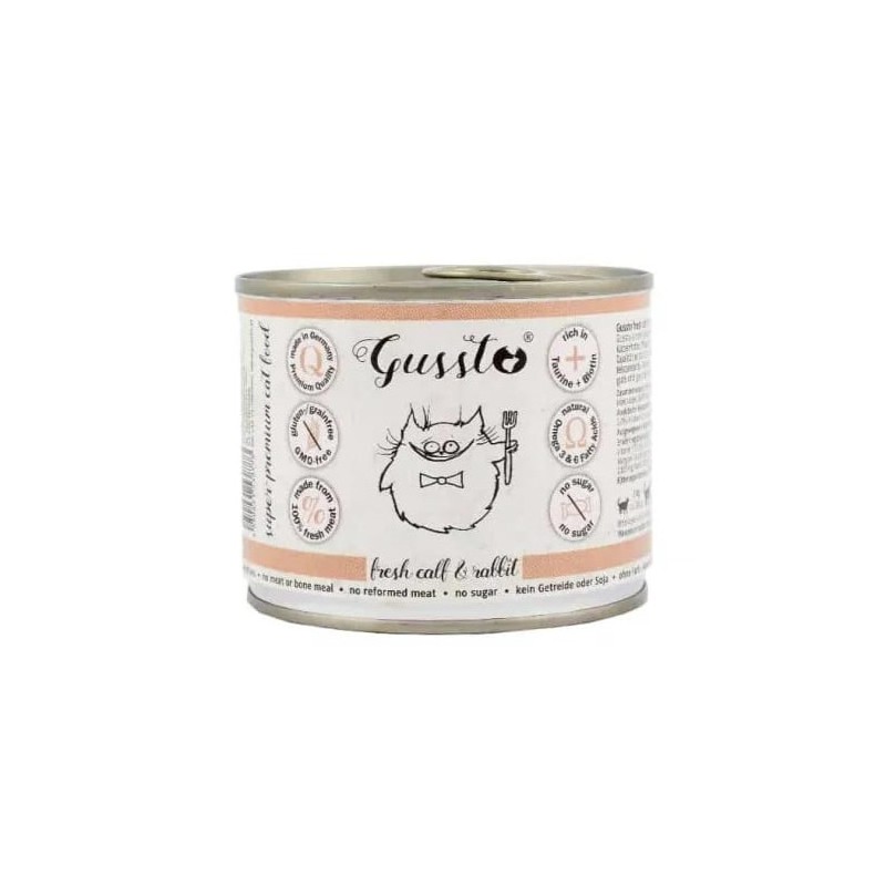 Mokra karma Gussto Fresh Calf & Rabbit produkowana jest w 100% z najwyższej jakości świeżego mięsa w wysokim standardzie odpowiadającym wymaganiom żywności dla ludzi. Gussto to esencja dobrego i zdrowego żywienia. Zawiera bardzo dużo mięsa idealnie odpowiadając specyficznym wymaganiom pokarmowym kotów. Jest to karma lekkostrawna i bardzo dobrze przyswajalna polecana również kotom o wrażliwym przewodzie pokarmowym. Stosowana także w dietach wykluczających przy alergiach pokarmowych. Znakomicie zrównoważony stosunek wapń/fosfor minimalizuje ryzyko chorób układu moczowego i nerek. Dodatkowo karma Gussto zawiera dużo niezbędnych witamin i minerałów jest bardzo bogata w Taurynę i Biotynę, a w jej skład wchodzi dobroczynny olej z ostropestu – bogaty w nienasycone kwasy tłuszczowe, który ma działanie przeciwzapalne, reguluje czynności trawienne i regeneracyjne wątroby, oraz wzmacnia system odpornościowy.
