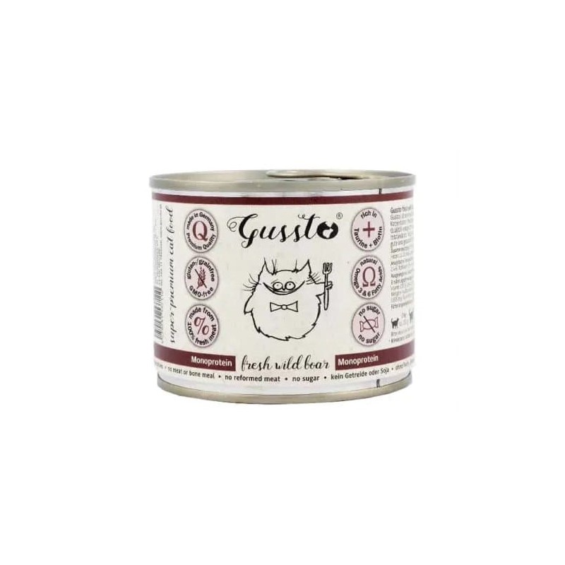 Mokra karma Gussto Fresh Wild Boar produkowana jest w 100% z najwyższej jakości świeżego mięsa w wysokim standardzie odpowiadającym wymaganiom żywności dla ludzi. Gussto to esencja dobrego i zdrowego żywienia. Zawiera bardzo dużo mięsa idealnie odpowiadając specyficznym wymaganiom pokarmowym kotów. Jest to karma lekkostrawna i bardzo dobrze przyswajalna polecana również kotom o wrażliwym przewodzie pokarmowym. Stosowana także w dietach wykluczających przy alergiach pokarmowych. Znakomicie zrównoważony stosunek wapń/fosfor minimalizuje ryzyko chorób układu moczowego i nerek. Dodatkowo karma Gussto zawiera dużo niezbędnych witamin i minerałów jest bardzo bogata w Taurynę i Biotynę, a w jej skład wchodzi dobroczynny olej z ostropestu – bogaty w nienasycone kwasy tłuszczowe, który ma działanie przeciwzapalne, reguluje czynności trawienne i regeneracyjne wątroby, oraz wzmacnia system odpornościowy.