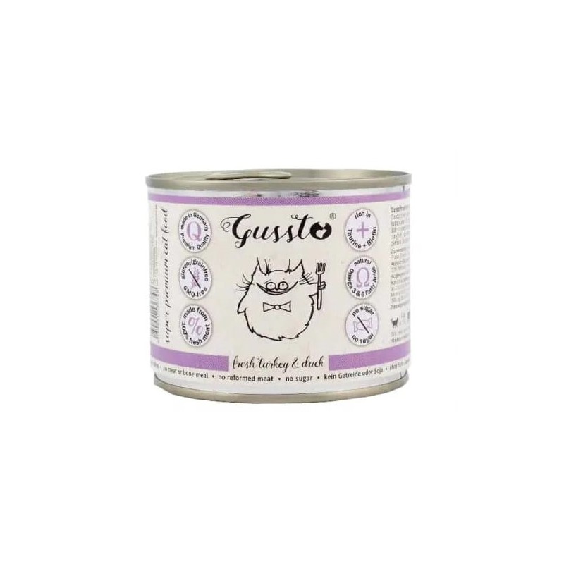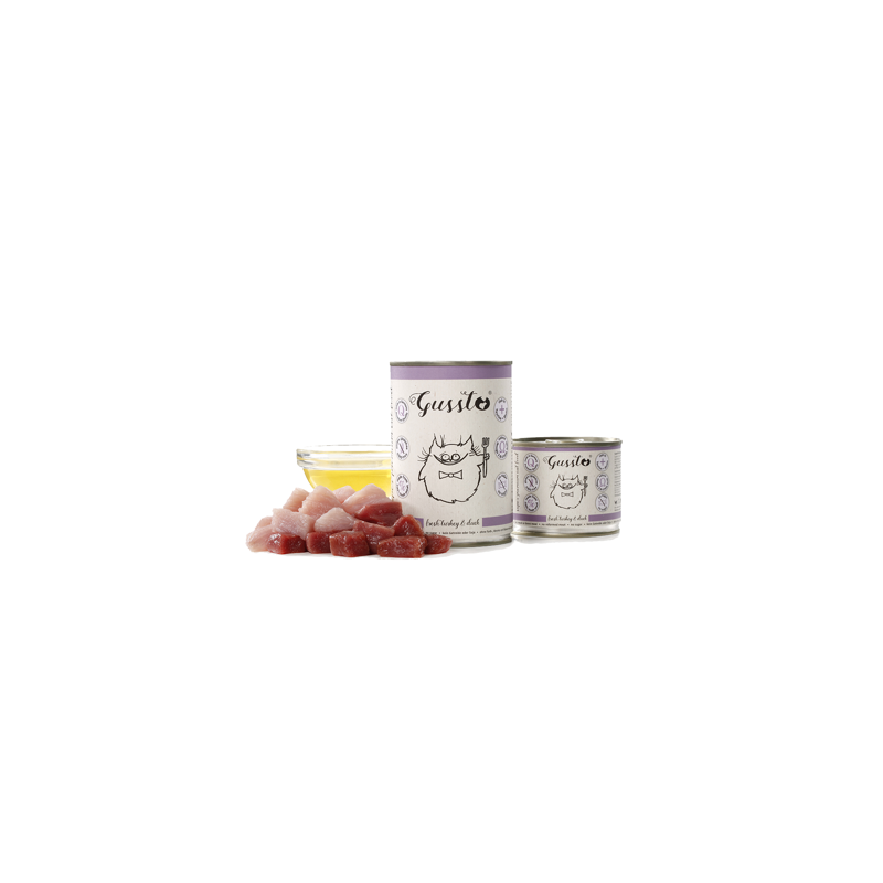 Mokra karma Gussto Fresh Turkey & Duck produkowana jest w 100% z najwyższej jakości świeżego mięsa w wysokim standardzie odpowiadającym wymaganiom żywności dla ludzi. Gussto to esencja dobrego i zdrowego żywienia. Zawiera bardzo dużo mięsa idealnie odpowiadając specyficznym wymaganiom pokarmowym kotów. Jest to karma lekkostrawna i bardzo dobrze przyswajalna polecana również kotom o wrażliwym przewodzie pokarmowym. Stosowana także w dietach wykluczających przy alergiach pokarmowych. Znakomicie zrównoważony stosunek wapń/fosfor minimalizuje ryzyko chorób układu moczowego i nerek. Dodatkowo karma Gussto zawiera dużo niezbędnych witamin i minerałów jest bardzo bogata w Taurynę i Biotynę, a w jej skład wchodzi dobroczynny olej z ostropestu – bogaty w nienasycone kwasy tłuszczowe, który ma działanie przeciwzapalne, reguluje czynności trawienne i regeneracyjne wątroby, oraz wzmacnia system odpornościowy.