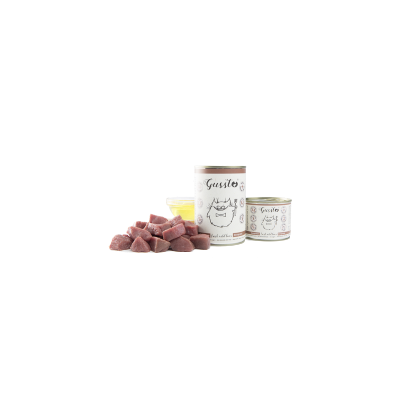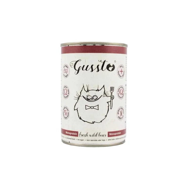 Mokra karma Gussto Fresh Wild Boar produkowana jest w 100% z najwyższej jakości świeżego mięsa w wysokim standardzie odpowiadającym wymaganiom żywności dla ludzi. Gussto to esencja dobrego i zdrowego żywienia. Zawiera bardzo dużo mięsa idealnie odpowiadając specyficznym wymaganiom pokarmowym kotów. Jest to karma lekkostrawna i bardzo dobrze przyswajalna polecana również kotom o wrażliwym przewodzie pokarmowym. Stosowana także w dietach wykluczających przy alergiach pokarmowych. Znakomicie zrównoważony stosunek wapń/fosfor minimalizuje ryzyko chorób układu moczowego i nerek. Dodatkowo karma Gussto zawiera dużo niezbędnych witamin i minerałów jest bardzo bogata w Taurynę i Biotynę, a w jej skład wchodzi dobroczynny olej z ostropestu – bogaty w nienasycone kwasy tłuszczowe, który ma działanie przeciwzapalne, reguluje czynności trawienne i regeneracyjne wątroby, oraz wzmacnia system odpornościowy.