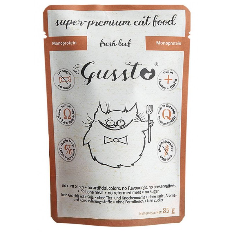 Mokra karma Gussto Fresh Beef produkowana jest w 100% z najwyższej jakości świeżego mięsa w wysokim standardzie odpowiadającym wymaganiom żywności dla ludzi. Gussto to esencja dobrego i zdrowego żywienia. Zawiera bardzo dużo mięsa idealnie odpowiadając specyficznym wymaganiom pokarmowym kotów. Jest to karma monobiałkowa, a więc holistyczna, lekkostrawna i bardzo dobrze przyswajalna polecana również kotom o wrażliwym przewodzie pokarmowym. Stosowana także w dietach wykluczających przy alergiach pokarmowych. Znakomicie zrównoważony stosunek wapń/fosfor minimalizuje ryzyko chorób układu moczowego i nerek. Dodatkowo karma Gussto zawiera dużo niezbędnych witamin i minerałów jest bardzo bogata w Taurynę i Biotynę, a w jej skład wchodzi dobroczynny olej z ostropestu – bogaty w nienasycone kwasy tłuszczowe, który ma działanie przeciwzapalne, reguluje czynności trawienne i regeneracyjne wątroby, oraz wzmacnia system odpornościowy.