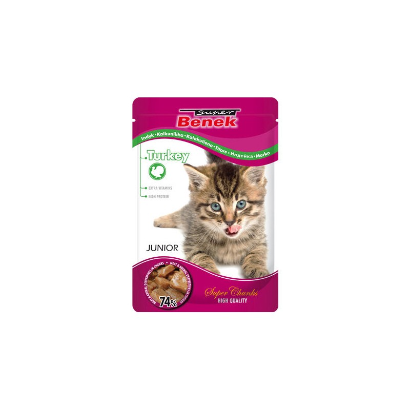 Super Benek Junior w sosie 100g pełnowartościowa mokra karma dla kociąt wszystkich ras. Przeznaczona dla kotów poniżej pierwszego roku życia. Kawałki mięsa przygotowane w delikatnym i smakowitym sosie.