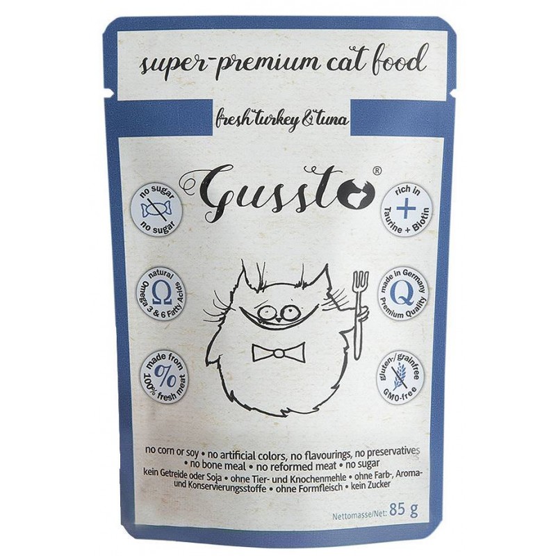 Mokra karma Gussto Fresh Turkey & Tuna produkowana jest w 100% z najwyższej jakości świeżego mięsa w wysokim standardzie odpowiadającym wymaganiom żywności dla ludzi. Gussto to esencja dobrego i zdrowego żywienia. Zawiera bardzo dużo mięsa idealnie odpowiadając specyficznym wymaganiom pokarmowym kotów. Jest to karma lekkostrawna i bardzo dobrze przyswajalna polecana również kotom o wrażliwym przewodzie pokarmowym. Stosowana także w dietach wykluczających przy alergiach pokarmowych. Znakomicie zrównoważony stosunek wapń/fosfor minimalizuje ryzyko chorób układu moczowego i nerek. Dodatkowo karma Gussto zawiera dużo niezbędnych witamin i minerałów jest bardzo bogata w Taurynę i Biotynę, a w jej skład wchodzi dobroczynny olej z ostropestu – bogaty w nienasycone kwasy tłuszczowe, który ma działanie przeciwzapalne, reguluje czynności trawienne i regeneracyjne wątroby, oraz wzmacnia system odpornościowy.