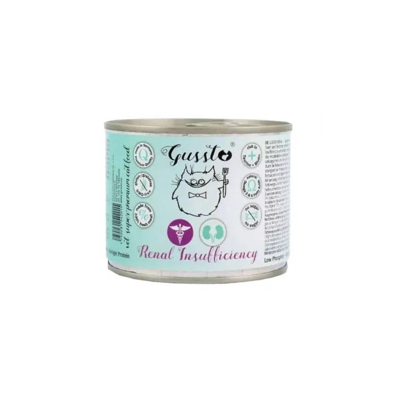Gussto Renal to pełnowartościowa, kompletna i znakomicie zbilansowana dieta nerkowa super-premium dla kotów. Powstała przy konsultacji dietetyków i lekarzy weterynarii w celu wsparcia leczenia chronicznej lub ostrej niewydolności nerek. Niska zawartość sodu i fosforu pomaga utrzymać równowagę metaboliczną organizmu, spowalnia postęp niewydolności i łagodzi objawy chorobowe. Obniżony poziom białka o wysokiej wartości biologicznej z najlepszych surowców odciąża nerki dostarczając odpowiedniej ilości energii i aminokwasów. Bataty są bogactwem beta-karotenu, który jest ważnym przeciwutleniaczem, są lekkostrawne, a przy okazji koją żołądek i jelita. Zawierając w swoim składzie witaminę-C i B-kompleks oraz żelazo i fosfor, są także doskonałym boosterem układu odpornościowego, a dzięki obecności w składzie – beta-karotenu, witaminy C i magnezu wykazują właściwości przeciwzapalne. Charakteryzują się niskim indeksem glikemicznym, więc proces uwalniania z nich energii jest powolny skutecznie regulując poziom glukozy we krwi. Dodatek cennego oleju z łososia wpływa na optymalną ilość kwasów tłuszczowych Omega 3 i 6 w odpowiednich proporcjach hamujących proces zapalny i wspomagających leczenie, a żurawina bogata w witaminy i minerały pomaga zapobiegać infekcjom dróg moczowych.