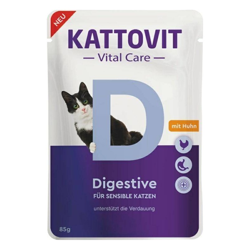 Kattovit Vital Care Digestive 85g dedykowana jest kotom o wrażliwym układzie pokarmowym. Karma ma ograniczoną ilością tłuszczu oraz zwiększoną dawkę elektrolitów. Karma dla kota wzbogacona o taurynę, która jest niezbędna do prawidłowego funkcjonowania kociego organizmu.