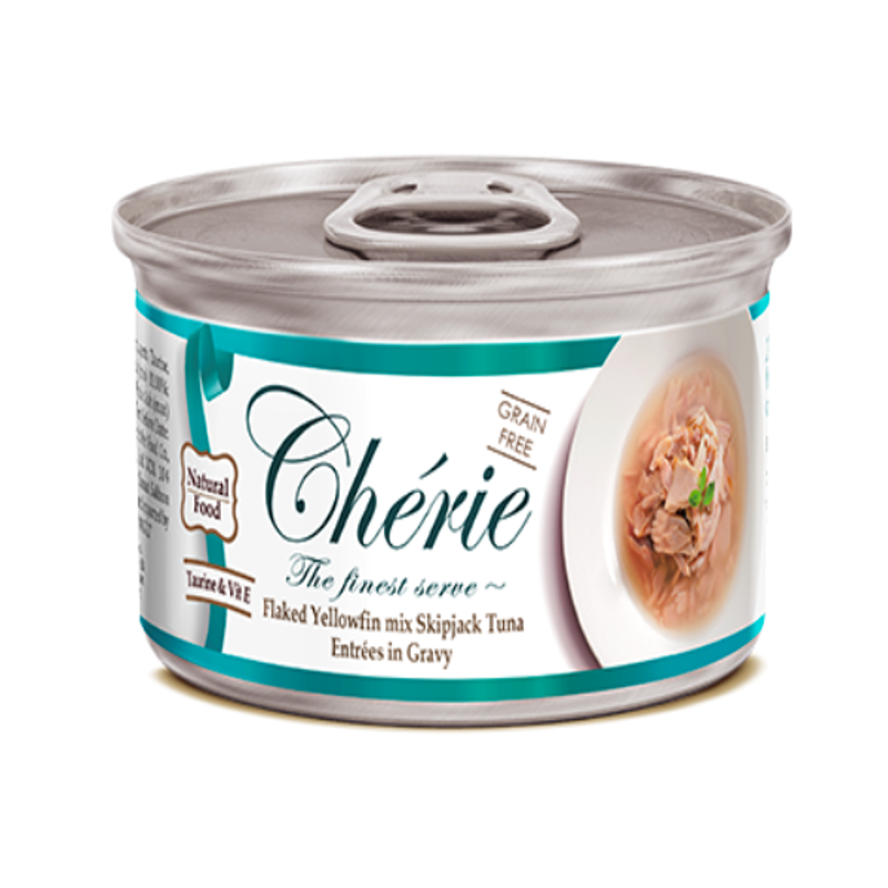 Pettric Cherie MIKS TUŃCZYKA W SOSIE to apetyczna przystawka dla Twojego mruczka. Naturalny smak i smakowity sos Chérie to luksusowe doznania smakowe dla kotów. Każdy autorski przepis zawiera delikatne kawałki naturalnych owoców morza w pysznym sosie.