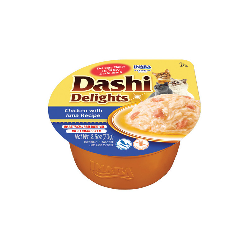 Inaba Dashi to mokra karma uzupełniająca dla kota o wysokiej wilgotności, bogata w białko, pozbawiona zbóż, niepożądanych dodatków oraz sztucznych składników. Dashi to tradycyjny japoński bulion rybny na bazie płatków z tuńczyka Bonito, słynącego z wyrazistego, bogatego smaku. Dashi Delights od Inaba sprawi, że każdy posiłek będzie wyjątkowy!