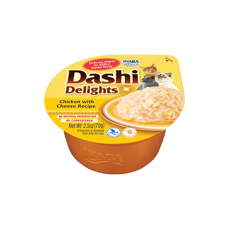 Inaba Dashi to mokra karma uzupełniająca dla kota o wysokiej wilgotności, bogata w białko, pozbawiona zbóż, niepożądanych dodatków oraz sztucznych składników. Dashi to tradycyjny japoński bulion rybny na bazie płatków z tuńczyka Bonito, słynącego z wyrazistego, bogatego smaku. Dashi Delights od Inaba sprawi, że każdy posiłek będzie wyjątkowy!