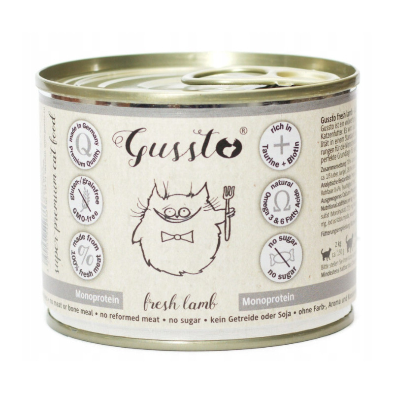 Mokra karma Gussto Fresh Lamb produkowana jest w 100% z najwyższej jakości świeżego mięsa w wysokim standardzie odpowiadającym wymaganiom żywności dla ludzi. Gussto to esencja dobrego i zdrowego żywienia. Zawiera bardzo dużo mięsa idealnie odpowiadając specyficznym wymaganiom pokarmowym kotów. Jest to karma monobiałkowa, a więc holistyczna, lekkostrawna i bardzo dobrze przyswajalna polecana również kotom o wrażliwym przewodzie pokarmowym. Stosowana także w dietach wykluczających przy alergiach pokarmowych. Znakomicie zrównoważony stosunek wapń/fosfor minimalizuje ryzyko chorób układu moczowego i nerek. Dodatkowo karma Gussto zawiera dużo niezbędnych witamin i minerałów jest bardzo bogata w Taurynę i Biotynę, a w jej skład wchodzi dobroczynny olej z ostropestu – bogaty w nienasycone kwasy tłuszczowe, który ma działanie przeciwzapalne, reguluje czynności trawienne i regeneracyjne wątroby, oraz wzmacnia system odpornościowy.
