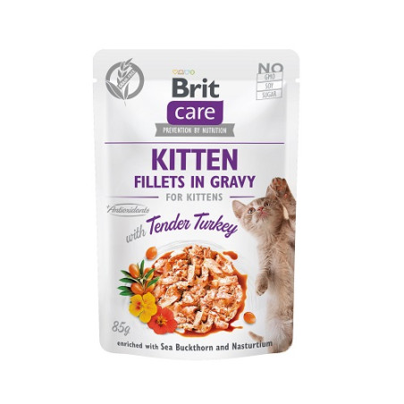 Brit Care Kitten Fillets in Gravy with Tender Turkey to kompletna, bezzbożowe karma z dodatkiem indyka dla kociąt. W składzie znajdują się pyszne filety mięsne w bulionie, a także dodatki w postaci rokitnika i nasturcji, które urozmaicą codzienną dietę. Karma Brit Care charakteryzuje się wysoką smakowitością i jest dobrze przyswajalna, nie obciąża układu pokarmowego młodego kota i jest chętnie jedzona nawet przez bardzo wybredne mruczki.
