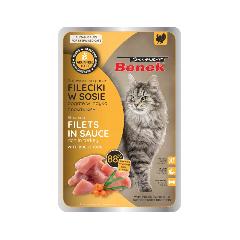 Pełnoporcjowa karma dla dorosłych kotów w formie filecików gotowanych na parze o wysokiej (88%) zawartości mięsa i składników pochodzenia zwierzęcego. Fileciki Super Benek wyróżnia bezzbożowa formuła, brak konserwantów, barwników sztucznych oraz składników modyfikowanych genetycznie. Odpowiednie dla kotów po zabiegach sterylizacji. Zawierają taurynę, witaminy oraz dodatek probiotyku – inuliny.
