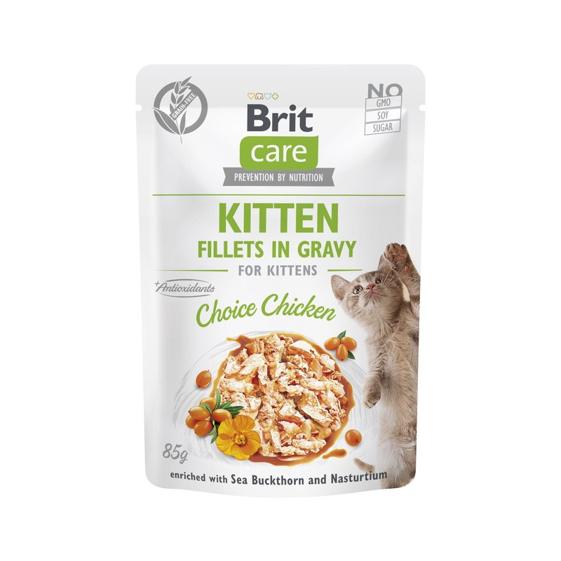 Brit Care Kitten Fillets in Gravy with Tender Chicken to kompletna, bezzbożowe karma z dodatkiem kurczaka dla kociąt. W składzie znajdują się pyszne filety mięsne w bulionie, a także dodatki w postaci rokitnika i nasturcji, które urozmaicą codzienną dietę. Karma Brit Care charakteryzuje się wysoką smakowitością i jest dobrze przyswajalna, nie obciąża układu pokarmowego młodego kota i jest chętnie jedzona nawet przez bardzo wybredne mruczki.