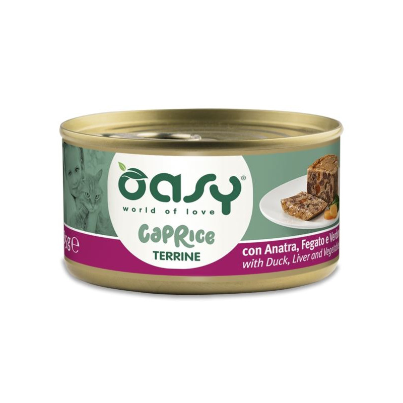 Oasy Caprice Terrine to pełnowartościowa karma mokra dla kotów w formie pysznego pasztetu. Jest to idealny posiłek nawet dla najbardziej wybrednych podniebień. Formuła karmy nie zawiera zbóż. GMO czy soi, wykonana z wysokiej jakości naturalnych składników, bez konserwantów i sztucznych aromatów.