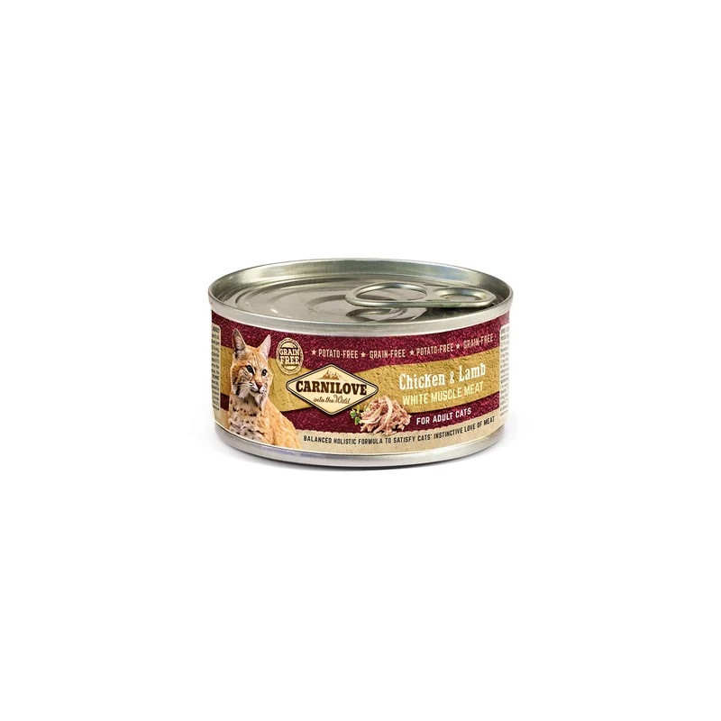 Carnilove Cat Adult Chicken & Lamb to pełnoporcjowa, wilgotna karma zaprojektowana z poszanowaniem natury kotów i ich pochodzenia. Karma o smaku kurczaka i jagnięciny została stworzona z myślą o kotach dorosłych. Unikalna receptura zawiera w swoim składzie starannie wyselekcjonowane dzikie mięso, warzywa, owoce i zioła, które całościowo pomagają dbać o kondycję organizmu. Kurczak jest doskonałym źródłem aminokwasów i minerałów, ma niską zawartość tłuszczu, a jagnięcina jest źródłem wysoko przyswajalnego białka dietetycznego. Receptura pozbawiona jest dodatku zbóż i ziemniaków, sztucznych aromatów i środków konserwujących.
