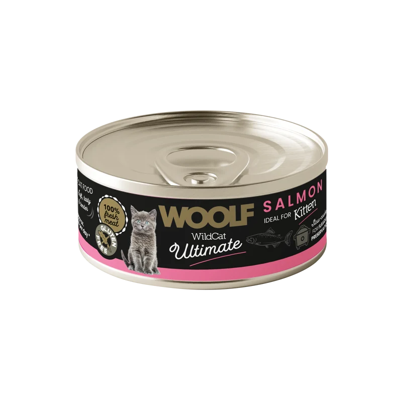 WOOLF Ultimate Cat Kitten Salmon to kompletna, bezglutenowa karma na bazie łososia stworzona z myślą o kociętach i młodych kotach. Receptura zawiera ograniczoną liczbę składników, pochodzących od lokalnych dostawców. Wszystkie składniki są poddane procesowi wolnego gotowania w niższej temperaturze dla zachowania wartości odżywczych oraz doskonałej smakowitości. Łosoś jest mięsem lekkostrawnym, zapewniającym wysoką podaż kwasów omega-3, niezbędnych do prawidłowego rozwoju rosnącego organizmu i jego funkcji poznawczych.