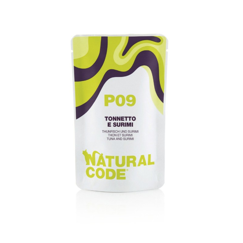 Natural Code Cat P09 Tuna Surimi to karma uzupełniająca dla kotów dorosłych. Połączenie tuńczyka i surimi dostarcza białek o wysokiej wartości odżywczej i kwasów tłuszczowych omega-3 oraz witaminy A i fosforu. Dodano także niewielki procent ryżu, który jest wysoce energetycznym i dobrze strawnym składnikiem. Dodano także odrobinę ryżu, który jest wysoce energetycznym i dobrze strawnym składnikiem.