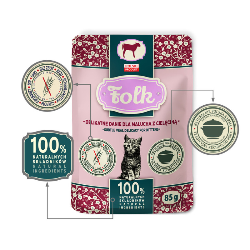 Karma FOLK dzięki odpowiednio skomponowanej przez naukowców z Pupil Instytutu Żywienia Zwierząt recepturze i wyjątkowemu smakowi jest najlepszą alternatywą dla rozpoczęcia żywienia pokarmem stałym kociąt. Całkowicie bezzbożowa receptura, bazująca na cielęcym mięsie, zmniejsza ryzyko wystąpienia reakcji alergicznych. Posiłek ten zapewnia więc zwierzęciu odpowiednią ilość energii, nie obciążając przy tym układu trawiennego, co sprawia, że to doskonały posiłek zarówno dla młodego kotka, jak i jego osłabionej ciążą i laktacją mamy.