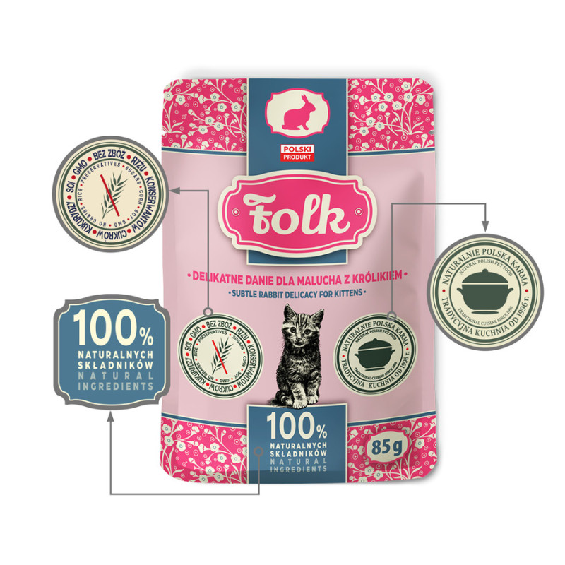 Karma FOLK dzięki odpowiednio skomponowanej przez naukowców z Pupil Instytutu Żywienia Zwierząt recepturze i wyjątkowemu smakowi jest najlepszą alternatywą dla rozpoczęcia żywienia pokarmem stałym kociąt. Całkowicie bezzbożowa receptura, bazująca na mięsie z królika, które charakteryzuje się niskim potencjałem alergennym, zmniejsza ryzyko wystąpienia reakcji alergicznych. Posiłek ten zapewnia więc zwierzęciu odpowiednią ilość energii, nie obciążając przy tym układu trawiennego, co sprawia, że to doskonały posiłek zarówno dla młodego kotka, jak i jego osłabionej ciążą i laktacją mamy.