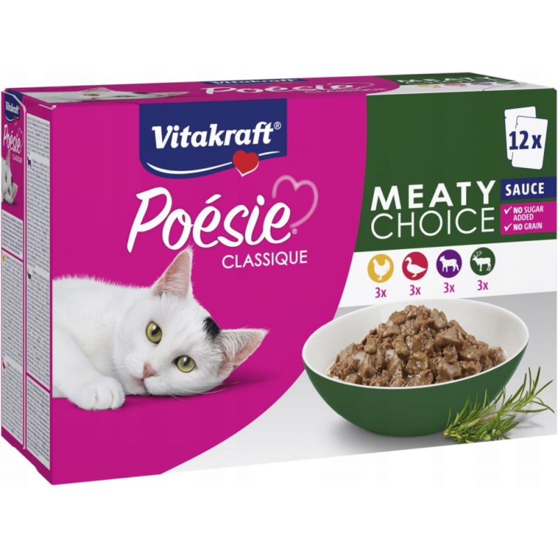 Wyselekcjonowana karma pełnoporcjowa mokra w sosie jest przygotowywana bez dodatku zbóż, cukru, sztucznych barwników i konserwantów. Opakowanie zbiorcze zawiera 12 torebek po 85 g każdy. Cztery różne warianty z kurczakiem, kaczką, jagnięciną oraz dziczyzną obiecują urozmaicone menu dla Twojego domowego pupila. Oczywiście receptura jest doskonale dostosowana żywieniowo do potrzeb kotów.