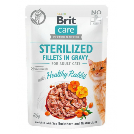 Brit Care Sterilised Cat Fillets in Gravy with Healthy Rabbit to kompletna, bezzbożowe karma z dodatkiem królika dla kotów po sterylizacji czy kastracji. W składzie znajdują się pyszne filety mięsne w bulionie, a także dodatki w postaci rokitnika i nasturcji, które urozmaicą codzienną dietę. Karma Brit Care charakteryzuje się wysoką smakowitością i jest dobrze przyswajalna, nie obciąża układu pokarmowego młodego kota i jest chętnie jedzona nawet przez bardzo wybredne mruczki.