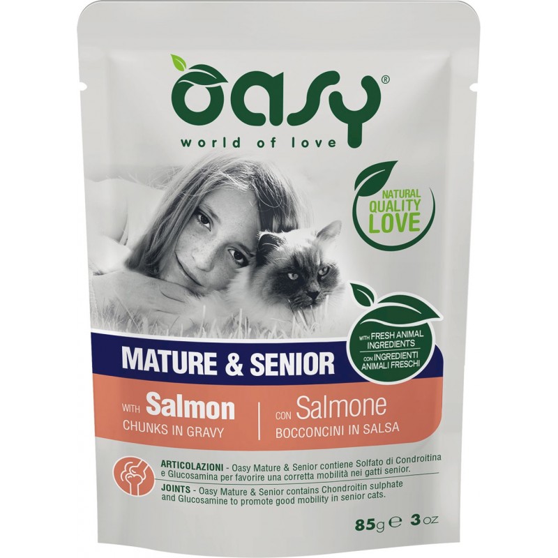 Karma mokra dla kotów Oasy z serii Lifestage to karma pełnoporcjowa przygotowana z wysokiej jakości składników, z wysoką zawartością mięsa i/lub ryby. Karma ma postać delikatnych kawałków w pysznym sosie. Nie zawierają sztucznych barwników, aromatów ani konserwantów. Produkowane bez użycia GMO i soi. Opracowane tak, aby zaspokoić szczególne wymagania kotów, także ze względu na ich wiek i specyficzne potrzeby.