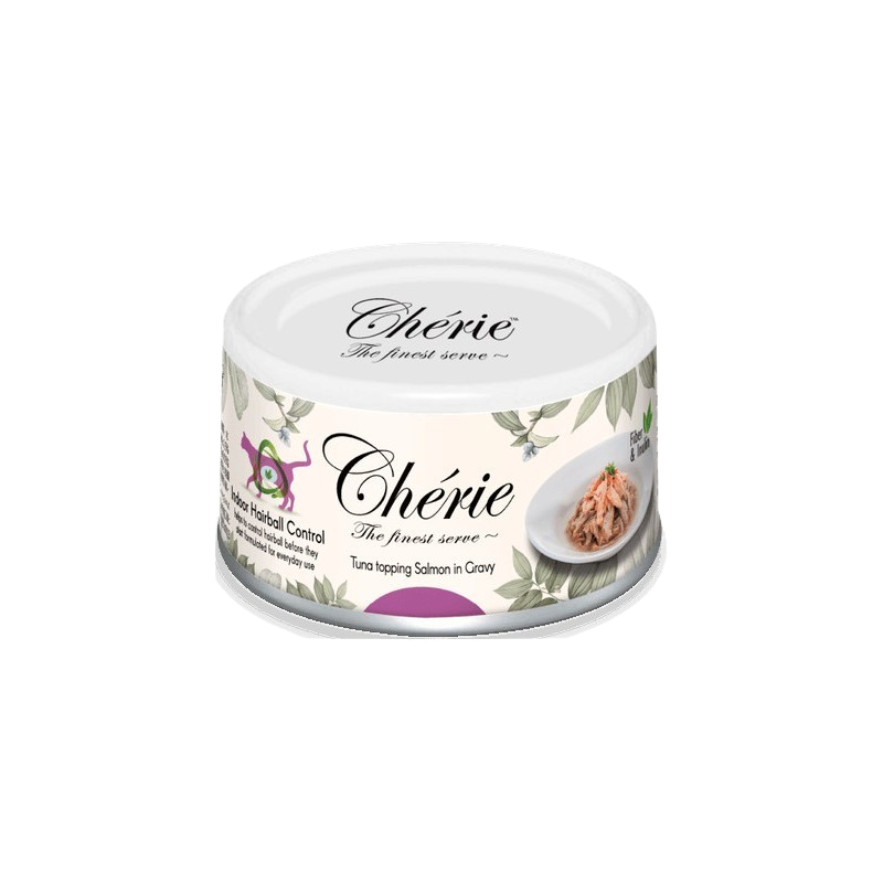 Cherie to ekskluzywna, uzupełniająca mokra karma w sosie, zaprojektowana specjalnie dla dorosłych kotów. Delikatne kawałki tuńczyka i łososia w soczystym sosie to smakowite doznanie i luksusowy dodatek do codziennej diety. Formuła wspomaga kontrolę kul włosowych i działa profilaktycznie na drogi moczowe