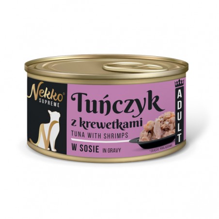 Skład: Białe mięso z tuńczyka 50%, krewetki 10%, roślinne zagęszczacze, ekstrakt z ryby.
