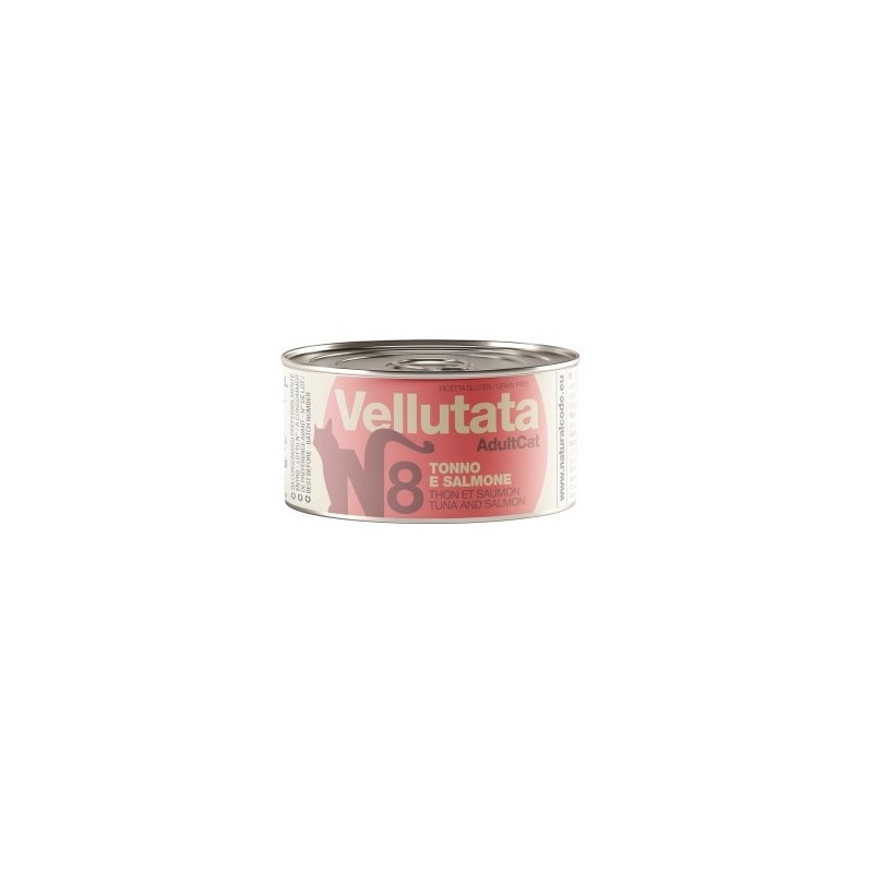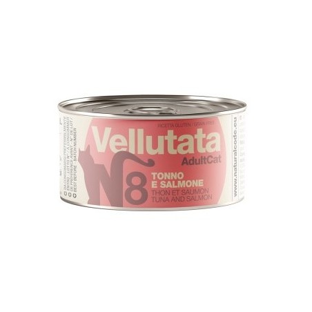 Vellutata V08 Tuna and salmon to karma uzupełniająca dla dorosłych kotów z dużą zawartością tuńczyka i łososia oraz dodatkiem skrobi z tapioki.